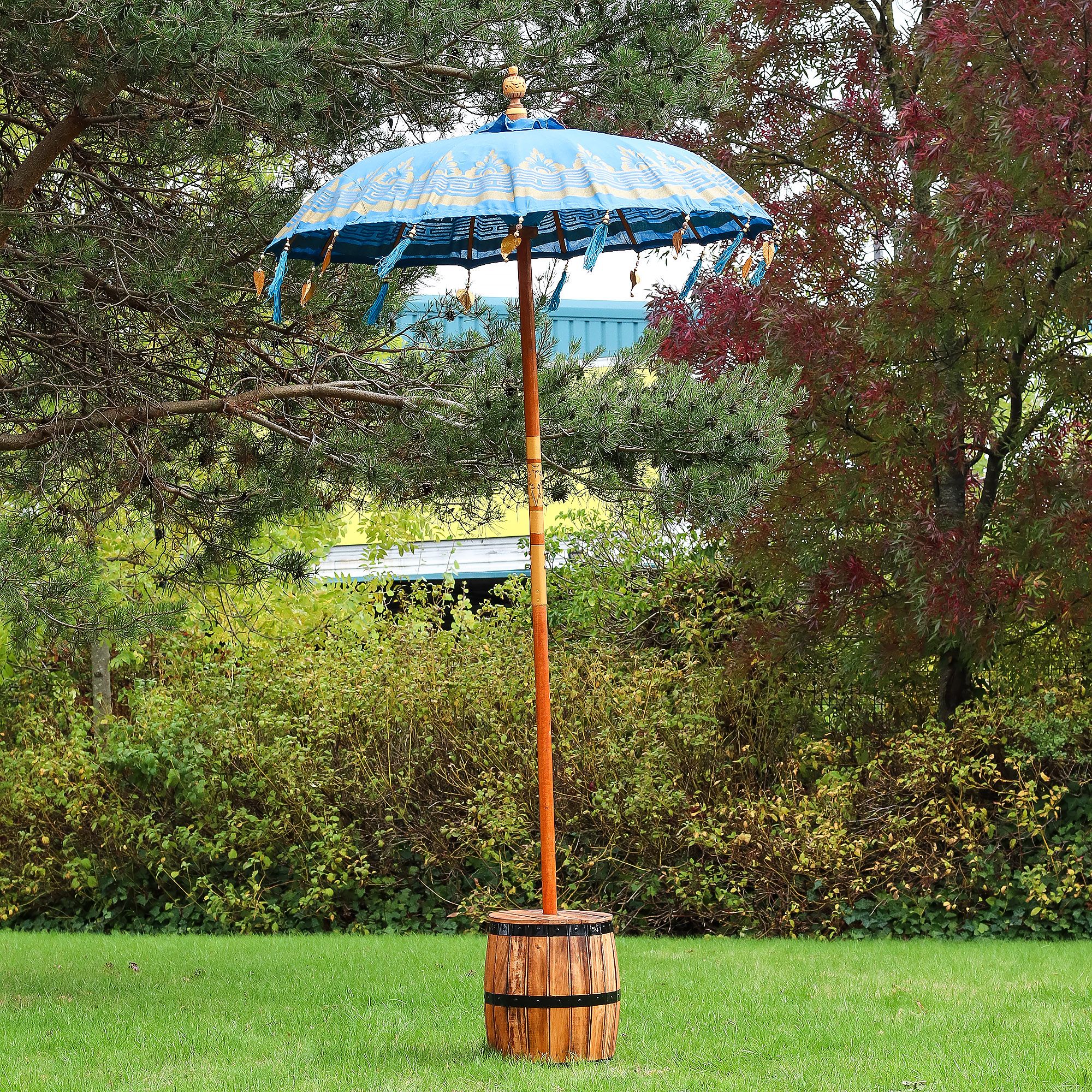 Bring a touch of Bali’s charm to your garden with this handmade turquoise patio parasol. The rich colour contrasts beautifully with the gold motifs and tassels, creating an elegant focal point for outdoor spaces.Standing 2 metres tall, this 1.5m parasol is crafted in Indonesia using Dorran wood, aluminium, and natural cotton.